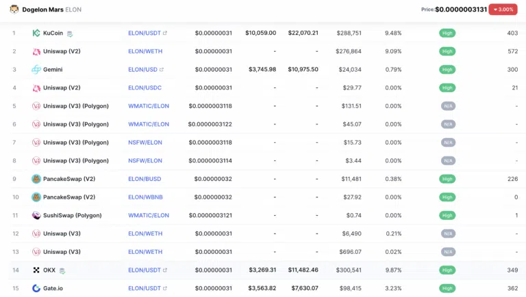 밈코인임에도 불구하고 도지론은 다양한 거래소에서 존재감을 드러내고 있다. 다음은 ELON 쌍을 거래할 수 있는 중앙 집중식 및 탈중앙화 거래소 상위 15개이다.