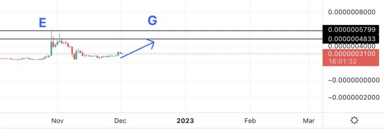 따라서 이 사이클의 저점이 O로 표시된 11월 21일 0.0000002553달러라면 다음 고점은 2023년 1월 27일 0.0000005795달러가 될 수 있다.