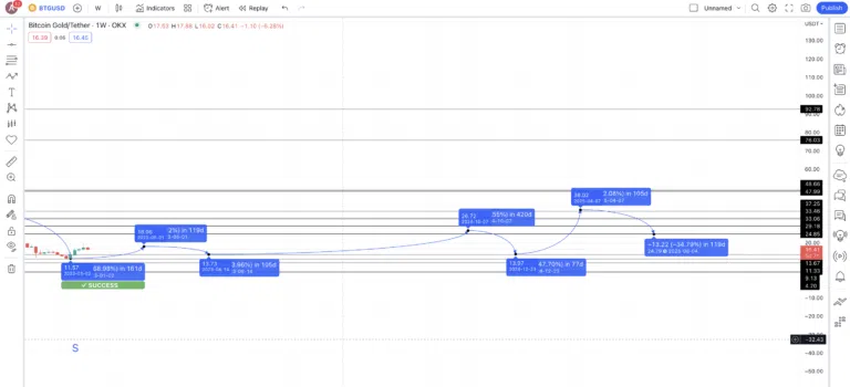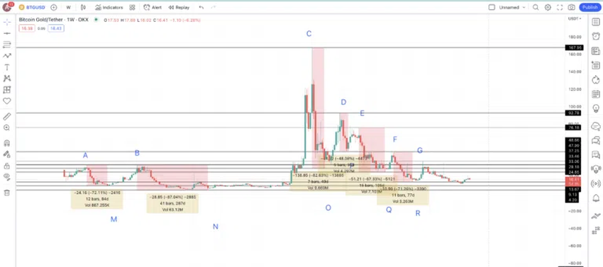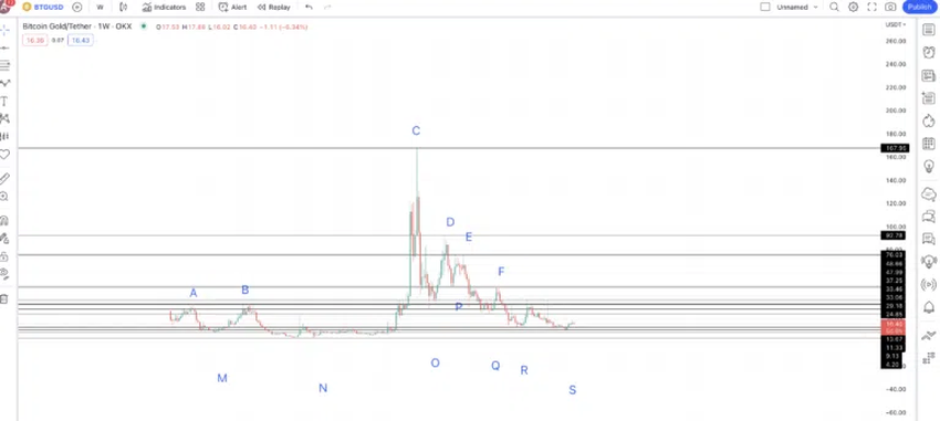 24시간 기준 차트를 보면 BTG 가격 추세가 상승 쐐기형 패턴으로 상승하다가 하락으로 접어들었다는 것을 알 수 있다. 이전 스윙 저점 및 고점을 사용하여 피보나치 선을 그으면 15.63달러 수준에서 강력한 지지가 있는 것으로 보인다.