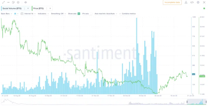 지표에 근거했을 때 머지않아 BTG 가격 박스권이 나타날 것으로 보인다. 하지만 소셜 채팅이 증가할 경우 이 현상이 역전될 가능성도 있다.