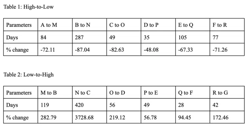 G가 차트의 마지막 점이라면 하락 또는 다음 저점(S)은 고점-저점 평균 -71.40%를 따를 것으로 예상할 수 있다. 시간 간격은 표 1의 데이터에서 볼 수 있듯 287일까지 늘어날 수 있다.