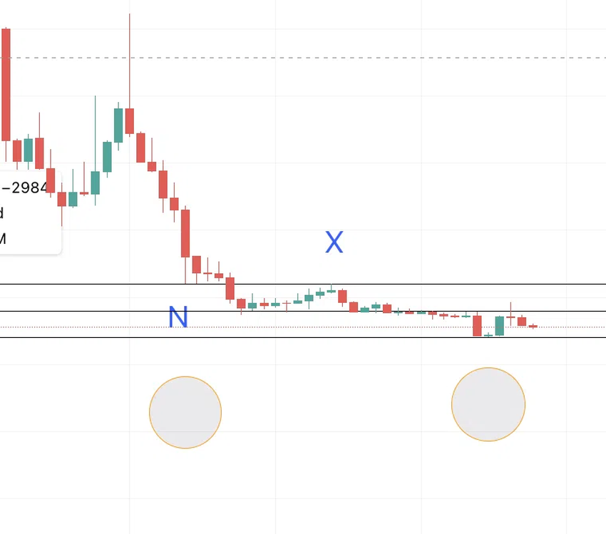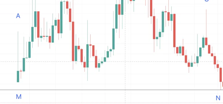 다음 차트를 자세히 보면 CELO 가격 차트에서 M 지점이 1차 저점이었다는 것을 알 수 있다. 두 번째 패턴에 따르면 1차 및 마지막 저점은 N이다. 이제 다음 저점-고점 경로를 찾기 위해 M에서 B, 그리고 N에서 F까지를 표시해보자.