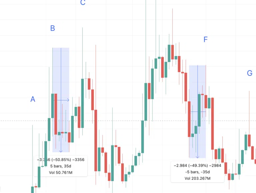 아래 차트에서 참고적으로 A부터 G까지로 지점을 표시했다. 수직선은 패턴이 끝나는 곳이다.
