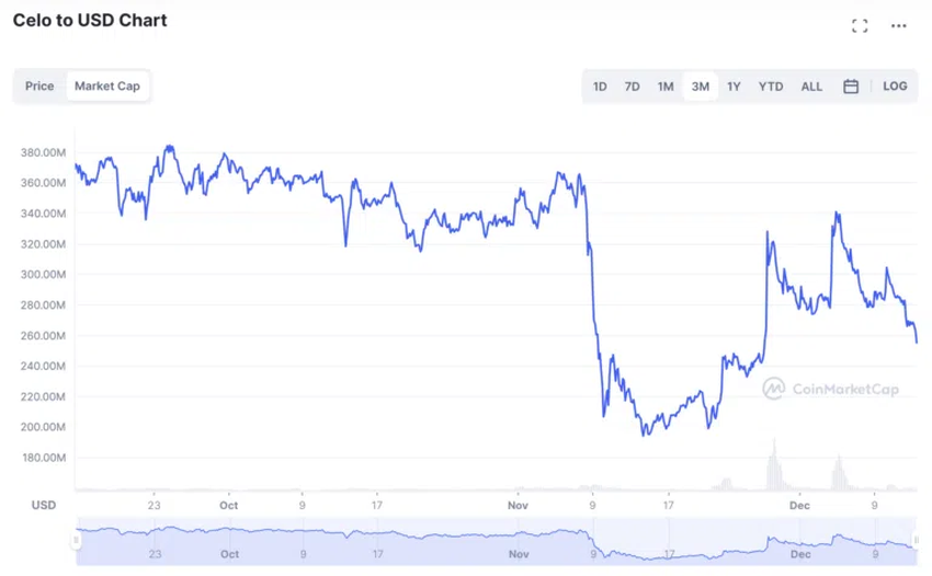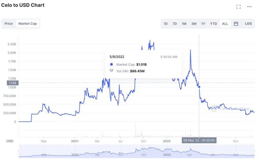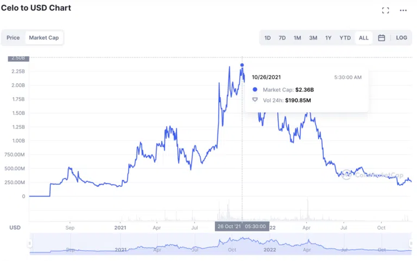 CELO의 시가총액은 2021년 10월 26일에 23억6000만달러, 거래량은 1억9085만달러로 정점을 찍었다. 이는 회전율 0.08에 해당된다.