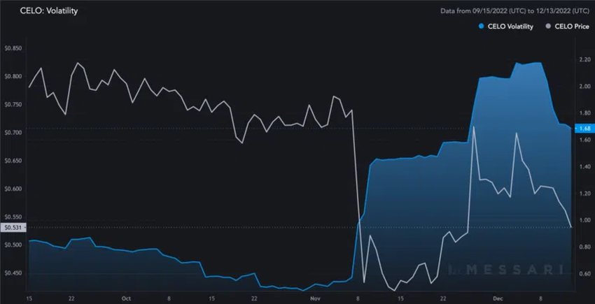 따라서 현시점 CELO의 변동성이 증가했으며, 이는 강세 가격 움직임에 긍정적인 단기 신호는 아닐 수 있다. 아래에 이를 보여주는 메사리 차트가 있다. CELO의 변동성이 지난 3개월 동안 정점을 찍은 것으로 보이기 때문에 이 변동성 계산은 유지된다. 그 과정에서 가격이 하락세를 겪었다.