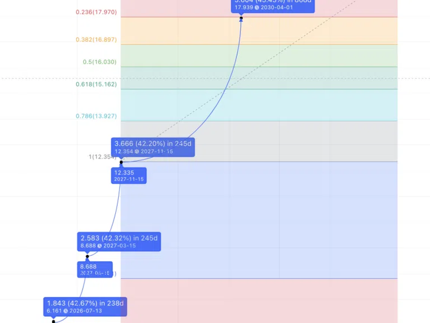 CELO가 2025년 최고치인 2.856달러에 도달하면 상승을 멈출 저항선이 많지 않다. 또한 2025년이 첫 번째 패턴의 C와 유사한 C1이라고 가정하자. 따라서 정점까지의 간격은 133일이고 50.89%의 성장률을 기록할 것이다.
