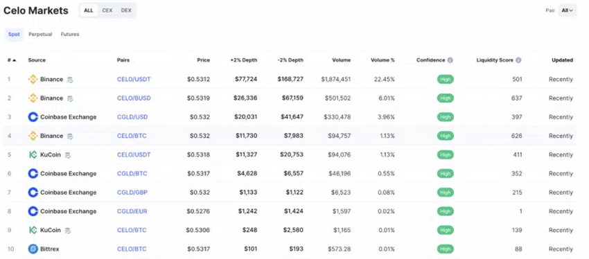 거래 시장을 살펴보면, CELO는 스팟(현물) 시장에서 좋은 거래소 스프레드를 가지고 있다. 이 가운데 CELO-USDT 거래량이 가장 많다. 대부분의 다른 시장들도 상당한 유동성 점수를 가지고 있어 변동성의 영향이 최소임을 보여준다.