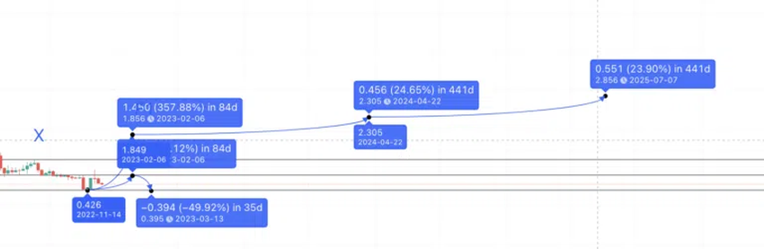 따라서 2023년 최고치가 0.782달러라면 최저치는 0.403달러에 가까울 수 있다. 또한 예상대로 고점이 1.856달러라면 저점은 0.97달러가 될 것이다.