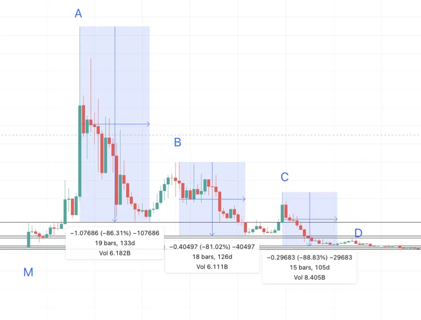 A – N = 133일 및 -86.38% 가격 변동, B – O = 126일 및 -81.02% 가격 변동, C – P = 105일 및 -88.83% 가격 변동.