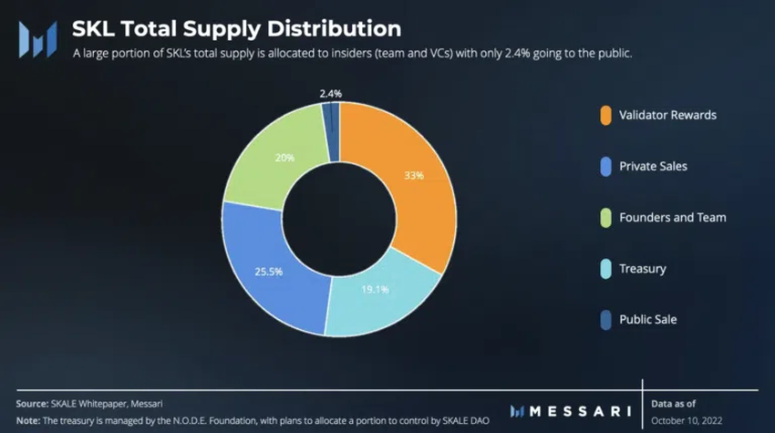 스케일은 SKL 토큰 70억개를 고정 공급하고 있다. 지난해 12월 23일 현재 순환 공급은 전체 공급의 58%를 차지한다. 그러나 우리의 관심은 자연스럽게 토큰의 분배 방식으로 흘러갈 것이다. 총 공급의 33%는 검증자 보상을 위한 것이며 네트워크 활동이 증가하면 보다 많은 SKL 토큰이 잠금해제 되도록 설정되어 있다.