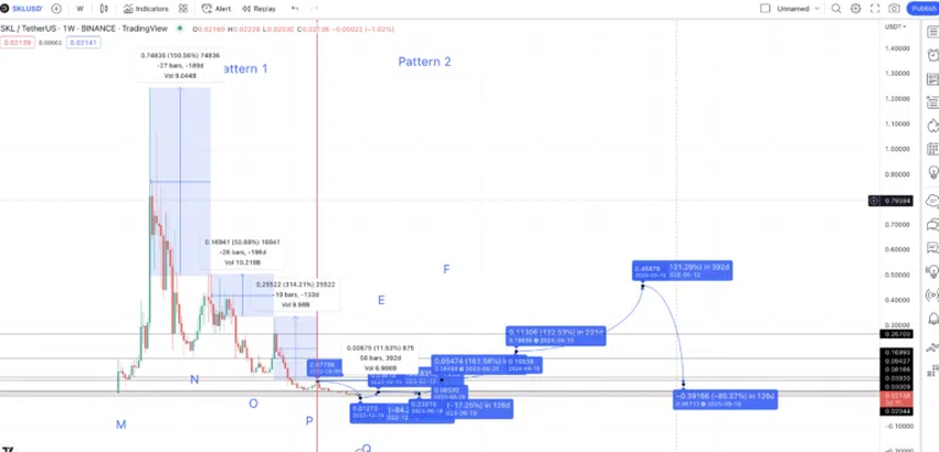 이제 2023년 저점 0.03009달러를 확보했으니 2024년의 저점-고점을 참조할 수 있다. 182.05%를 한도로 유지하면 예측선을 2023년에 표면화되는 0.08489달러로 끌어올릴 수 있다. 따라서 2023년 SKL 가격 전망치는 0.08489달러로 최고치를 기록했다.