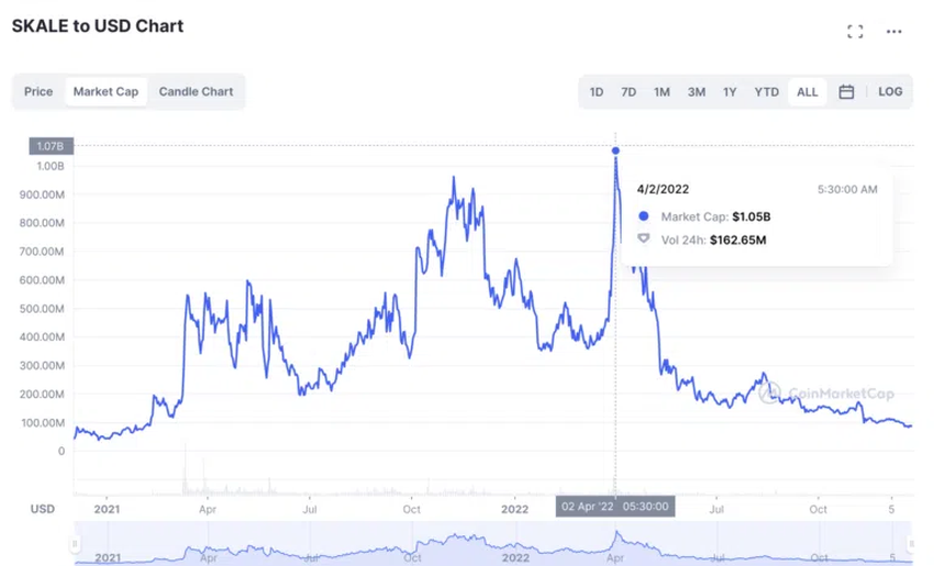 - SKL 토큰의 최고 가격은 2021년 3월 12일 1.22달러였다.