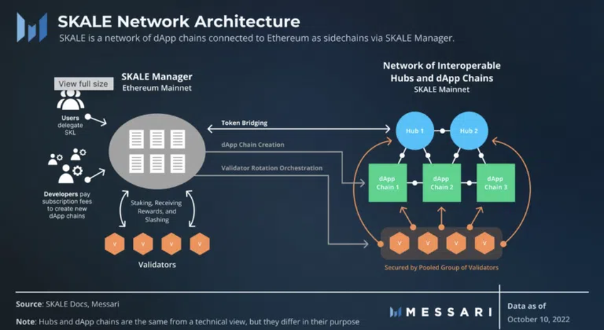 - 스케일 네트워크 아키텍처는 디앱에 따라 사이드체인을 이더리움 네트워크에 연결하는 ‘스케일 매니저’(SKALE manger)라는 퍼실리테이터를 사용한다.