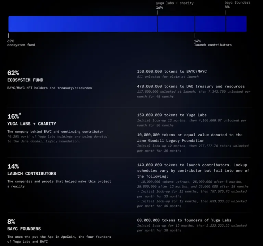좀 더 구체적인 분배 수치를 보면 생태계 펀드 전체 공급 비중이 62%에 달한다. 이 토큰은 출시 시 잠금 해제(‘락업’이라고 함)되며 NFT 보유자와 트레저리를 위한 것이다. 나머지 16%는 유가랩스와 자선단체에 기부되지만, 12개월의 초기 투자 기간과 36개월에 걸친 시한부 출시가 있다.