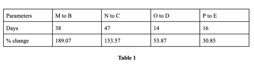 평균 거리와 가격 변동은 29일(최대 47일)과 106.84%이다. 단, APE에 대한 과거 데이터가 많지 않기 때문에 거리가 달라질 수 있다. 또한 현재 상대적으로 약세인 암호화폐 시장 분위기도 감안해야 한다. M에서 E까지의 총 거리는 115일이며, 이는 다음 고점이 나타나는 곳이기도 하다.