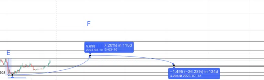 데이터로 주어진 표에 따르면 E 다음의 고점을 F로 표시하면 5.698달러로 나타난다. F는 여전히 E보다 낮으며, 이는 APE가 올해 3월에도 고점 패턴을 형성하지 않을 수 있음을 뜻한다. F에서의 하락은 124일 만에 57.92%의 저점으로 나타날 수 있다.