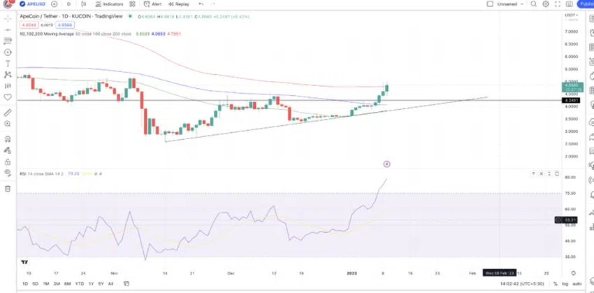 2023년 중반까지 시장 상황이 개선될 것이라는 점을 고려하면 하락폭이 4.20달러로 제한될 것으로 예상할 수 있는데, 이는 지지선인 4.177달러와 일치한다. 이는 에이프 코인 가격표(저저점으로 표시)에서 볼 수 있는 하락 추세가 꺾일 수 있는 지점이다.
