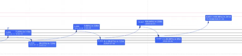 2023년, 2024년, 2025년 그리고 2026년 APE 가격 전망치를 꼼꼼히 살펴보면 고점을 높이는 파동 형성이 뚜렷하다. 이제 2026년의 고점과 2025년의 저점을 마음대로 사용할 수 있다. 피보나치 수준을 사용하여 2030년까지의 경로를 추정하는 것이 가능해진다는 얘기다.