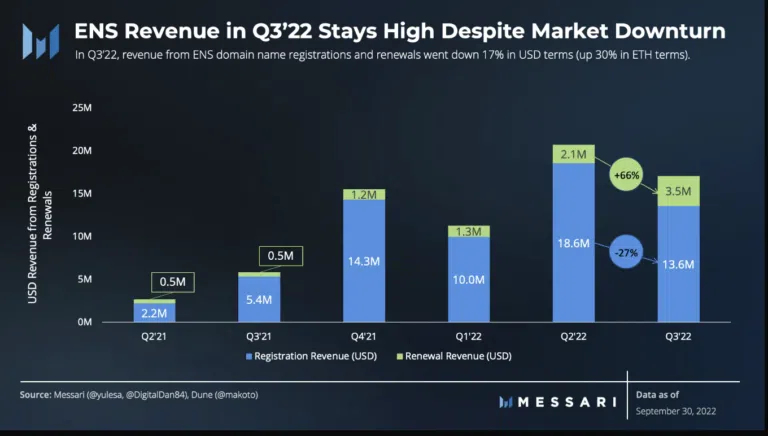 시장 침체와 주요 암호화폐의 가격이 바닥을 뚫고 하락했음에도 불구하고, ENS 수익은 증가했다. 다만 USD 수치로는 등록 수익이 27% 감소한 반면 갱신 수익은 66% 증가했다.