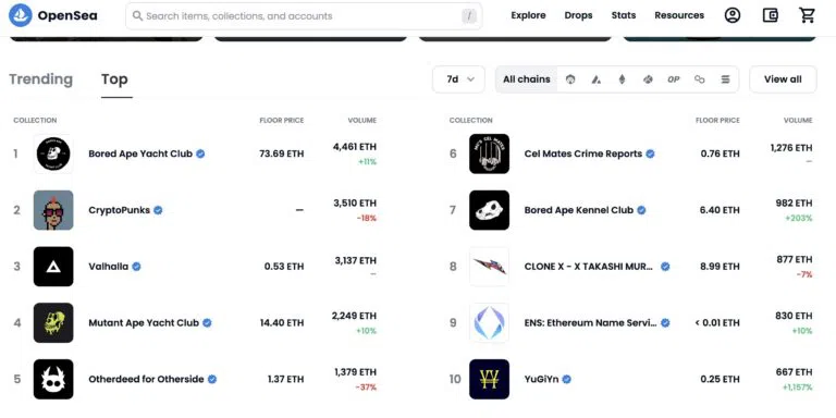 다음은 지난 7일간의 볼륨별 상위 NFT 컬렉션이 포함된 오픈씨(OpenSea) 통계이다. ENS는 목록에서 9위를 차지한다. 게다가 30일 목록에서는 7위를차지한다.