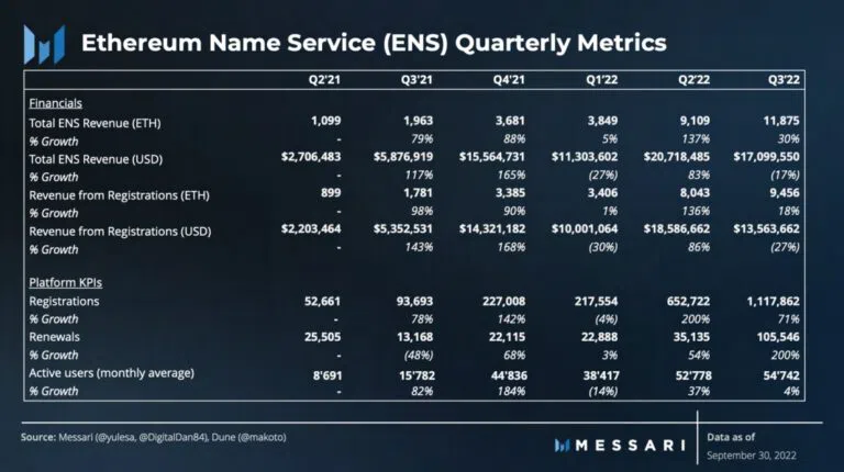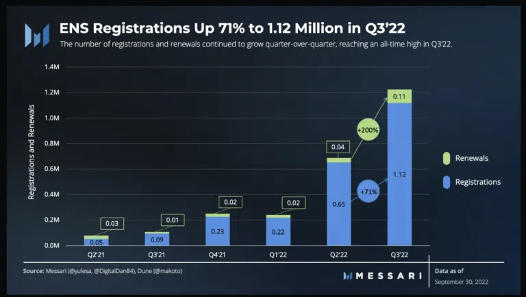 2022년 3분기는 원시 수치 측면에서 ENS 도메인에서 최고였다. 이더리움 네임서비스는 현재 ETH 가격 기준 매출액 기준 1만1875ETH를 기록, 2022년 2분기를 30% 앞섰다. 심지어 도메인 등록도 2022년 3분기에 111만7천862개로 역대 최고치를 기록했다. 2022년 2분기와 비교해 71% 성장한 수치이다.
