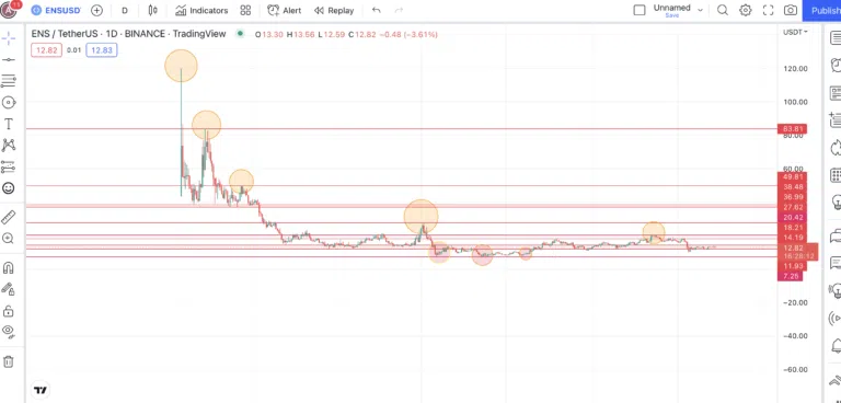 현재 ENS는 프레스 타임 기준 사상 최고치보다 84.70% 하락한 12.78달러에 거래되고 있다.