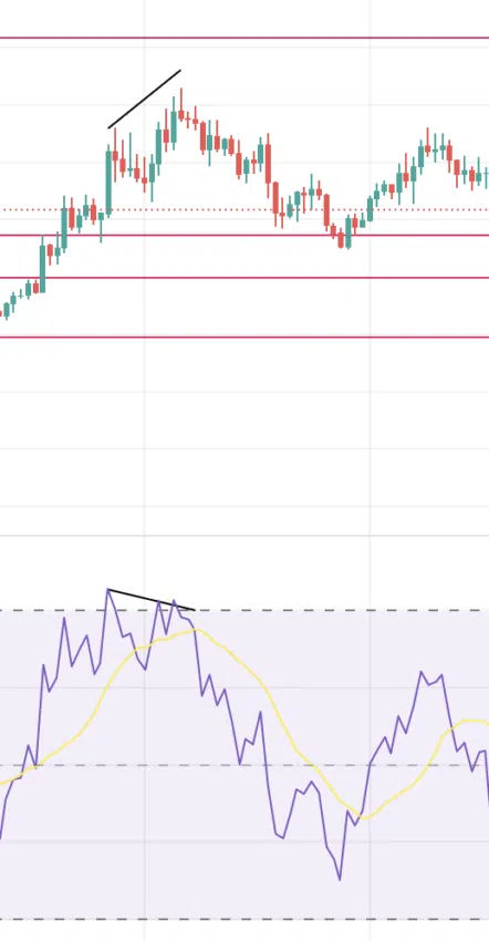 고점에서 모멘텀 지표인 RSI(상대강도지수: 주가의 상승압력과 하락압력간의 상대적인 강도를 나타냄)를 자세히 보면 다음과 같은 패턴을 볼 수 있다.