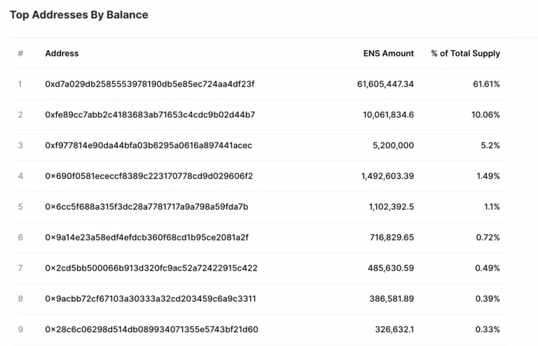 또한 상위 3개 주소는 ENS 전체 순환 공급의 76% 이상을 차지한다. 거대한 ENS 고래(대형 보유자)들이 오프로딩하기로 계획한 경우 ENS는 덤핑에 취약해진다는 얘기다.