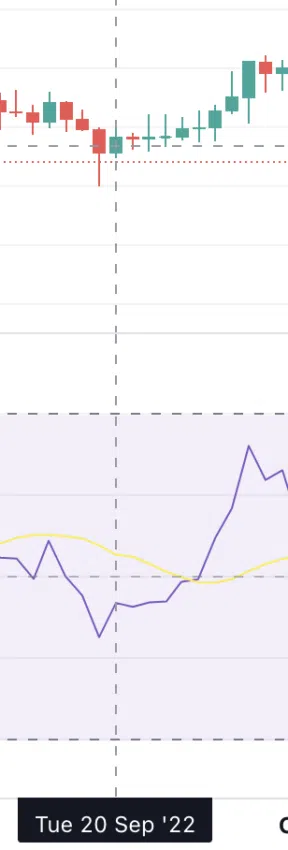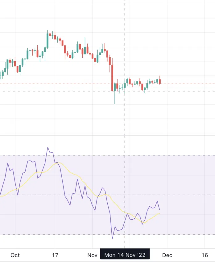 - ENS 토큰 가격은 다이버전스에 잘 반응한다. 여기서 RSI가 저고점을 기록하고 가격이 고고점을 기록하고 있는 약세 다이버전스가 나타난다. 얼마 지나지 않아 가격 조정이 뒤따랐다.