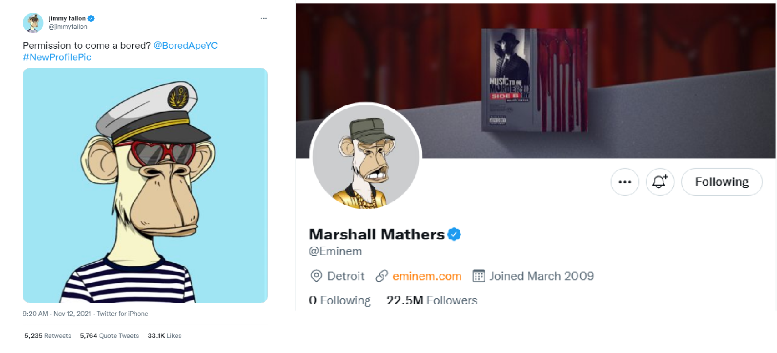 최근 몇 달간 특정 NFT 투자가 비트코인이나 이더리움 같은 암호화폐를 앞지르고 있다. 제이 지, 지미 팰런, 에미넴 등 유명 인사들이 NFT를 구매해 트위터에 올리면서 한정판으로 토큰화된 예술에 대한 수요가 늘고 있다.