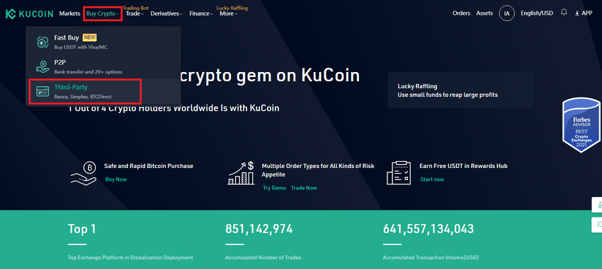 신용카드나 직불카드를 이용해 암호화폐를 구매하고 싶다면 쿠코인 홈페이지로 이동해 페이지 상단의 ‘Buy Crypto”(암호화폐 구매)’ 옵션을 클릭하면 된다. “Third-party” (다른 방법)”을 선택한다.