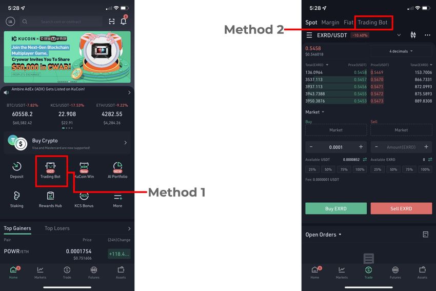 방법 2: 쿠코인 앱을 열고 트레이드를 선택한 다음 트레이딩 봇을 선택한다.