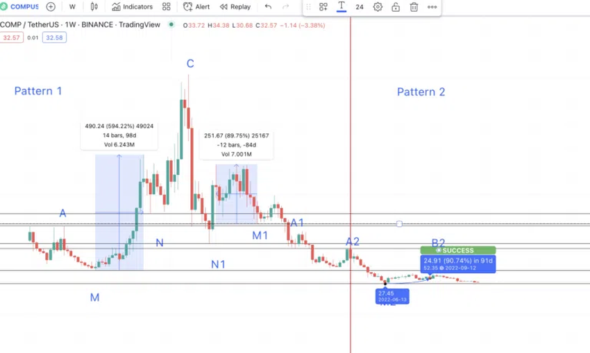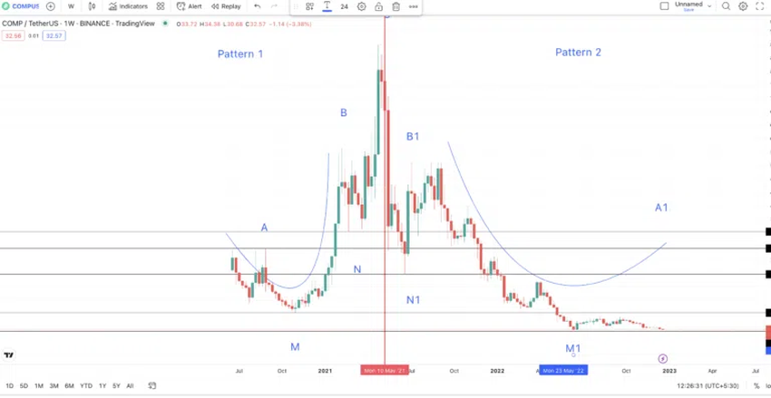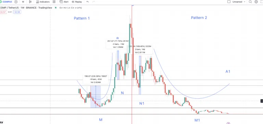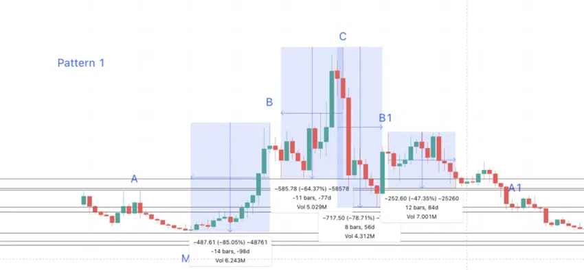 패턴 1의 B1-M1-A1 곡선은 패턴 이론이 유지하기 위해 B-M-A와 유사한 경로를 추적해야 한다는 점에 유의해야 한다. C에서 B, C에서 B1까지의 최저점을 각각 N과 N1로 표시하자. 이렇게 함으로써 저점 범위에서 고점 범위를 계산할 수 있으며 A1의 위치를 찾을 수 있다.