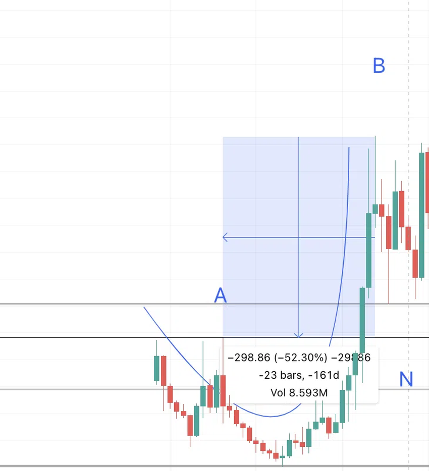 A에서 B까지는 161일이고 52.30% 하락했다. 따라서 B1에서 A1까지는 동일한 간격 및 백분율 감소가 나타날 수 있다.