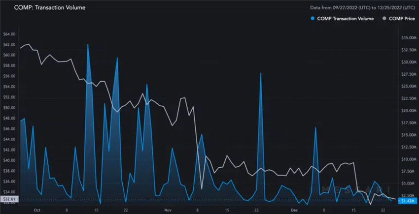 우선 COMP의 거래량은 지난 3개월간 제자리걸음을 했다. 가격도 마찬가지였으며, 이는 높은 거래량이 가격을 끌어올릴 수 있다는 점을 보여준다.