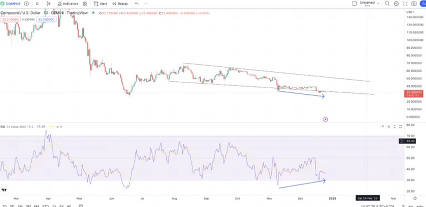 이 예측에서는 COMP가 현재 강세 하강 쐐기(Descending wedge, 디센딩 웨지) 패턴 내에서 거래되고 있다는 것을 보기 위해 COMP의 일일 차트를 도출했다. COMP가 상위 추세선을 돌파하면 가격이 빠르게 상승할 수 있다.