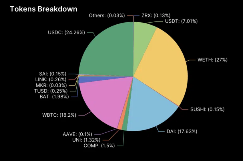 - 컴파운드는 디지털 자산이 상당히 고르게 분포되어 있으며, WETH(Wrapped ETH, 랩드이더)와 USDC가 풀의 대부분을 차지한다.
