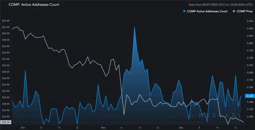 지난 11월 MVRV는 부정적인 영역에 있었다. 현재 COMP 토큰의 가격이 낮은 수준에서 거래되고 있더라도 과거에 낮은 MVRV 수준이 가격 급등으로 이어진 적이 있다는 점을 기억해야 한다.