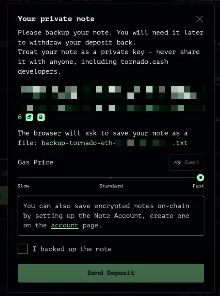 이렇게 해서 예금이 완료되면, 토네이도 캐시는 약속 또는 개인 노트라고 불리는 비밀 해시가 있는 키를 생성한다. 이 지폐는 현재 토네이도 캐시의 스마트 계약서에 보관되어 있는 예금 금액과 연결된다.