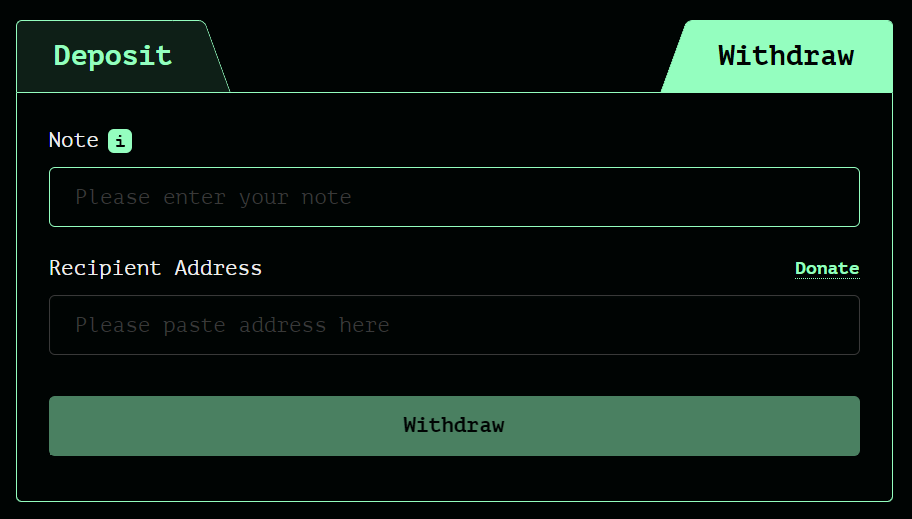 트랜잭션의 인출 마지막 단계에서 프라이버시를 확보하기 위해 최소 5건의 확인이 완료될 때까지 기다리는 것이 좋다. 마지막으로 수신자는 저장된 개인 메모를 수신자의 주소와 함께 제출한다.