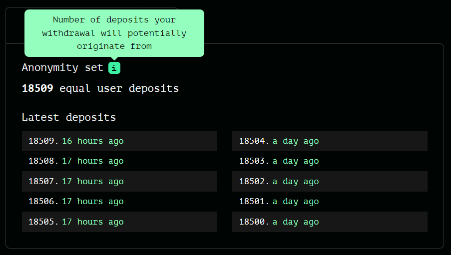 익명성 세트는 스마트 계약 내에서 인출을 기다리는 일련의 트랜잭션일 뿐이다. 또한 인출할 수 있는 예금 수도 표시해준다.