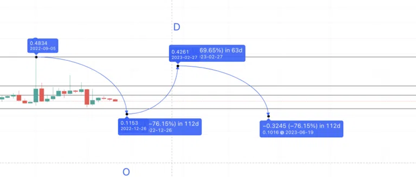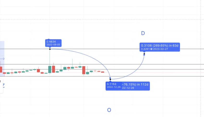 고점 사이의 평균 시간은 182일이다. 따라서 D 이후 저점에서 다음 고점까지는 120일이 걸리고 267.16% 상승할 수 있다. 다음 고점 예상 가격은 0.6255달러지만 시장 상황으로 인해 이 가격대에는 2024년 초에 도달할 수도 있을 것으로 보인다.