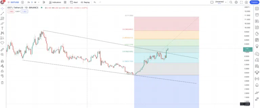 DOT에 대한 단기 가격 분석부터 시작하자. 상위 추세선이 폴링 웻지(하락 쐐기형) 패턴에서 이탈하는 것이 뚜렷하게 보인다. 이 때 흥미롭게도 DOT의 가격이 이탈과 동시에 즉각적인 저항선인 7.77달러에 상당히 근접했다.