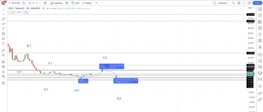 따라서 다음 고점(A2)은 9.823달러에 표면화될 것으로 예상된다( 2023년의 DOT 예상 가격). 10달러에 가까운 고점에 도달한 후 저점의 경우 약간의 매도가 있을 것으로 보인다. 이 경우 가격이 -51.89%까지 상승할 수 있다. 이는 2023년 DOT 최저 가격 예측이 4.75달러에서 지지를 받을 수 있음을 나타낸다.