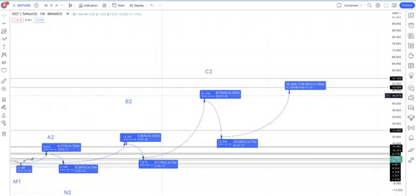 이러한 예측은 단기적이지만 DOT의 주별 가격 차트를 확인하여 장기적인 가격 움직임을 추적하고 명확한 패턴을 식별할 수 있다.