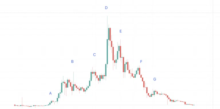 X-A = 77일 및 2349.19%의 가격 변동, M-B = 91일 및 965.58%, N-C = 35일 및 180.82%, O-D = 42일 및 279.79%, P-D = 28일 및 143.51%, Q-E = 49일 및 130.5%, R-F = 35일 및 313.68%, Y-G = 196일 및 662.05% 가격 변동