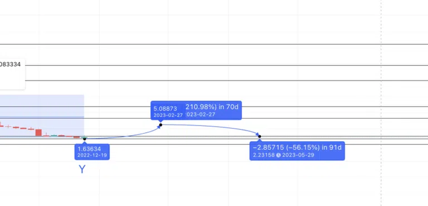 데이터 세트 2의 저점-고점 이동 평균 209.66%는 2024년 예상 가격 수준을 6.99달러로 제시한다. 2024년 저점은 3.08달러로 91일 만에 56.50% 하락했다. 이 계산은 데이터 세트 1에서 최저 백분율 및 최장 일수를 기반으로 한다.