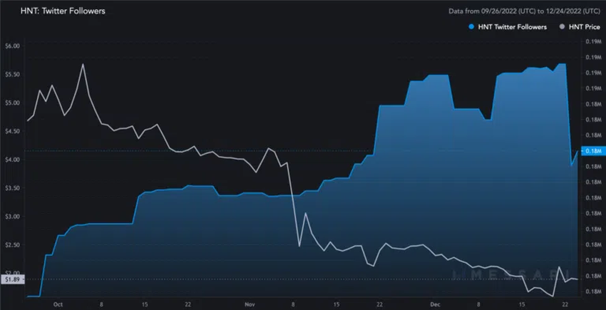헬륨의 공식 트위터 핸들은 낮은 가격에도 불구하고 구독자들의 수가 12월에 정점을 찍었다는 것을 보여준다. 이는 가격 하락에도 불구하고 사람들이 HNT에 여전히 관심이 있다는 것을 의미한다.