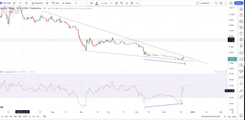 또한 RSI(상대강도지수)는 강세 다이버전스를 보이며, 따라서 가격은 고저점 다음에 저저점을 형성하고 있다. 따라서 HNT의 단기 상승은 불가능하지 않다. 일별 차트에서 강력한 저항선은 5.12달러며, 이는 2023년에 5.08달러가 가능함을 보여준다.