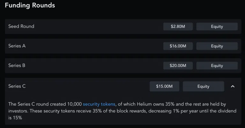 헬륨의 토큰 배분은 투명성이 뛰어난 것으로 알려져 있다. 우선, 사전 채굴(pre-mine) 또는 초기 배분이 없었다. 네트워크가 활성화된 후 HNT 토큰은 참여형 핫스팟으로 공개됐다. 시드 라운드 규모는 280만달러였다.